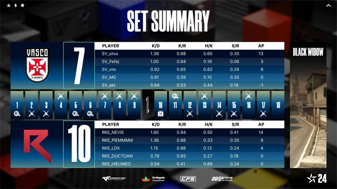 第四场比赛SV以小比分7-10、10-4、10-6,大比分2-1击败RKE,silva获得全场MVP。第一图黑色城镇-CFS,RKE以3-0开局,SV进攻打不开局面,NEVIS三连杀,上半场RKE领先1分,下半场SV紧咬分差,RKE更胜一筹以10-7取得胜利。第二图异域小城-CFS,RKE频繁RUSH但节奏脱节,SV以守为攻以6-3领先,HIEUMEO四连杀帮助队伍止损,SV全员发力以9-4先到局点,SV乘胜追击以10-4取得胜利。第三图潜艇-CFS,SV以3-0开局,RKE在上半场仅追回2分,SV以7-2领先,下半场PIE与NEVIS轮番爆发,RKE将比分追至6-8,SV顺势以10-6取得胜利。