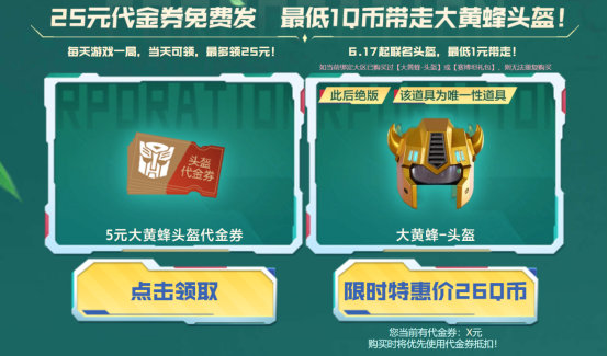 每天游戏1局,当天可领5元大黄蜂头盔代金券,最多可领25元。可用于购买大黄蜂-头盔,最低1Q币即可将其拿下!非常酷炫的联动款装饰品,与擎天柱-头盔属于一套哦!一起拿下收藏价值更高哦!