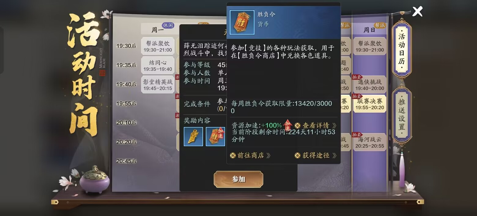 必参加!周四是帮派联赛初赛,这个奖励是无法找回的,必须参加。海河令最重要的获取渠道,不仅有海河令还有四海镖旗。每周最重要的活动之一。