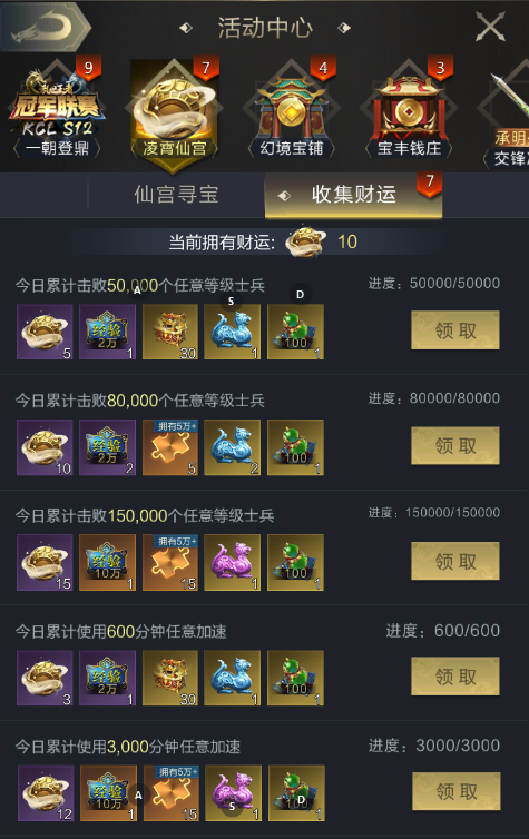 活动期间,完成财运任务,可获得对应的任务奖励和财运奖励。财运可用于升级貔貅和仙宫寻宝,貔貅等级越高探宝的奖励越好!