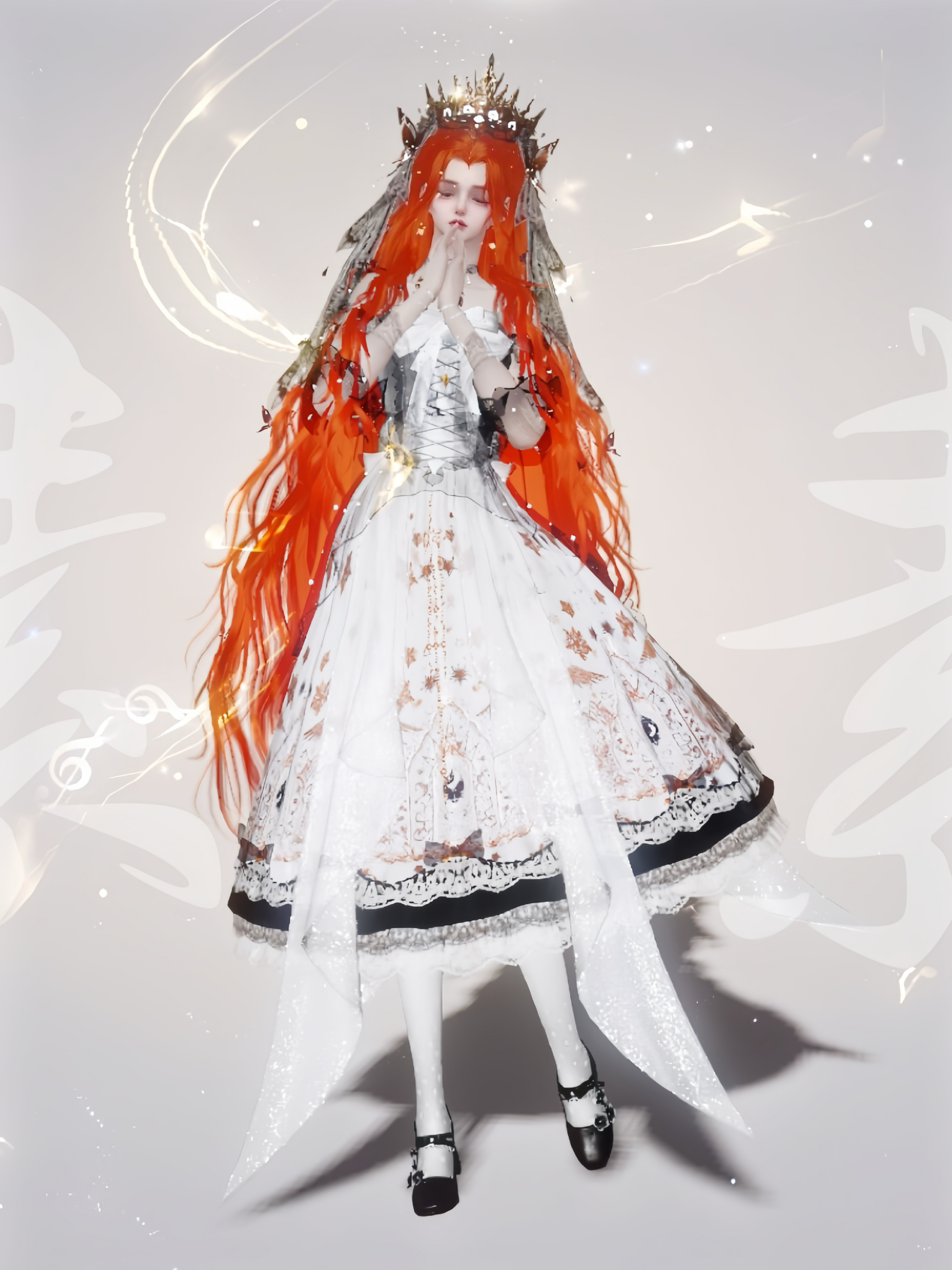 这套穿搭具有浓厚的维多利亚风格与神话元素,整体造型典雅而富有仪式感,白色象征纯洁和神圣,而橙红色则给人以热情和力量的感觉,仿佛神秘仪式中的圣洁公主。