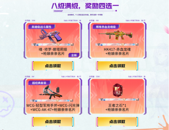 完成当日游戏、登录掌火、输入平台兑换码等任务后,还可获得枪娘锤,消耗枪娘锤可进行升级,本次共分为笑脸级、专家级、荣耀级和枪王级。其中有机会获得青铜M4、野战军AK等经典武器,也有萌杀&卡通系列,最高可获得英雄级。值得注意的是,整个模块只能领取一次,之后将会关闭炼金坊。