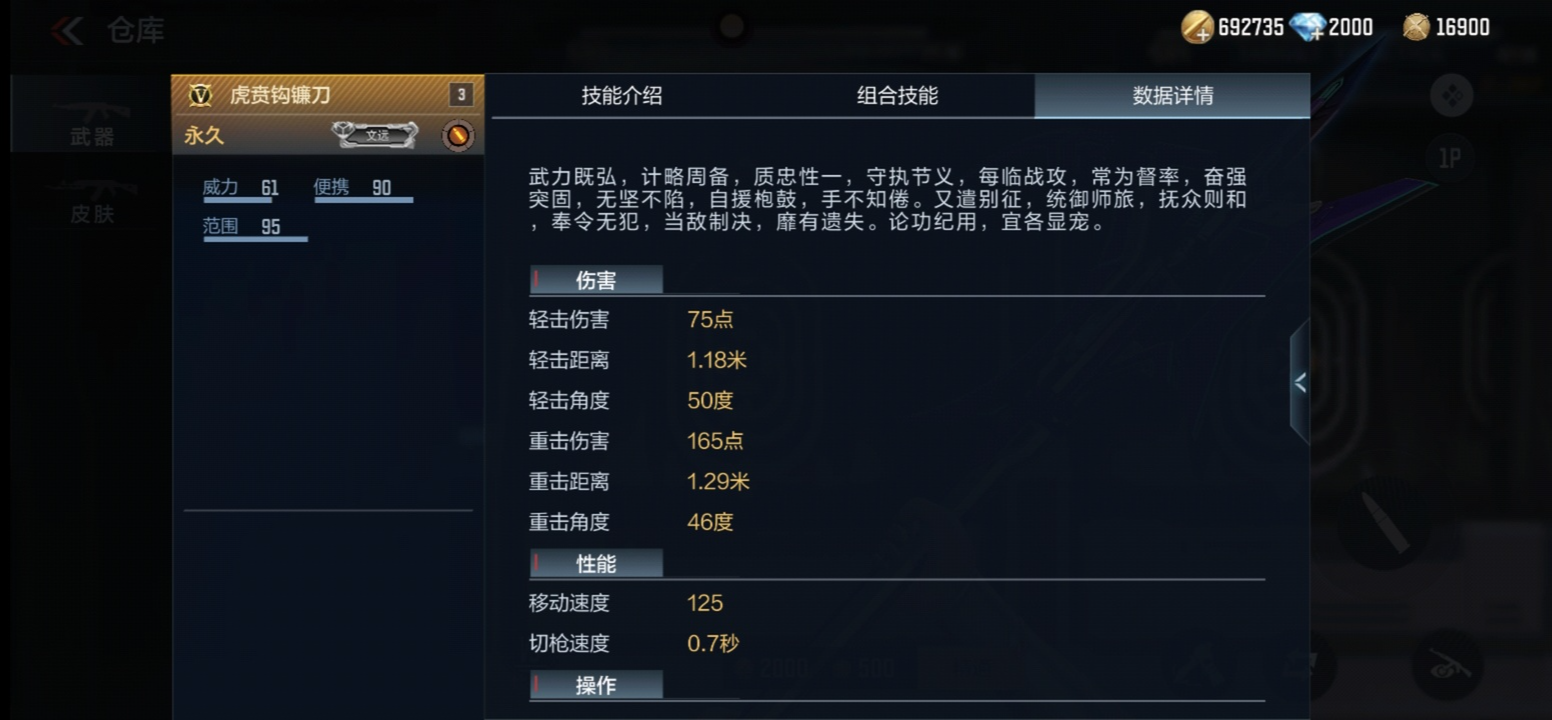 在性能方面,虎贲钩镰刀的移动速度和虚空之锤-妙才的一致,但是切枪速度要比其他两款近战武器稍微逊色一些,不过玩近战模式也不太需要切枪速度。平时搭配武器使用,这点数据差异也不会造成什么影响,可以忽略不计。