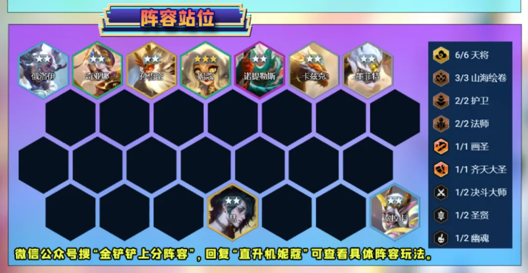 该阵容由妮蔻、卡兹克、墨菲特、奇亚娜、俄洛伊、索拉卡、诺提勒斯、孙悟空、慧组成,羁绊由6天将、3山海绘卷、2护卫、2法师构成。