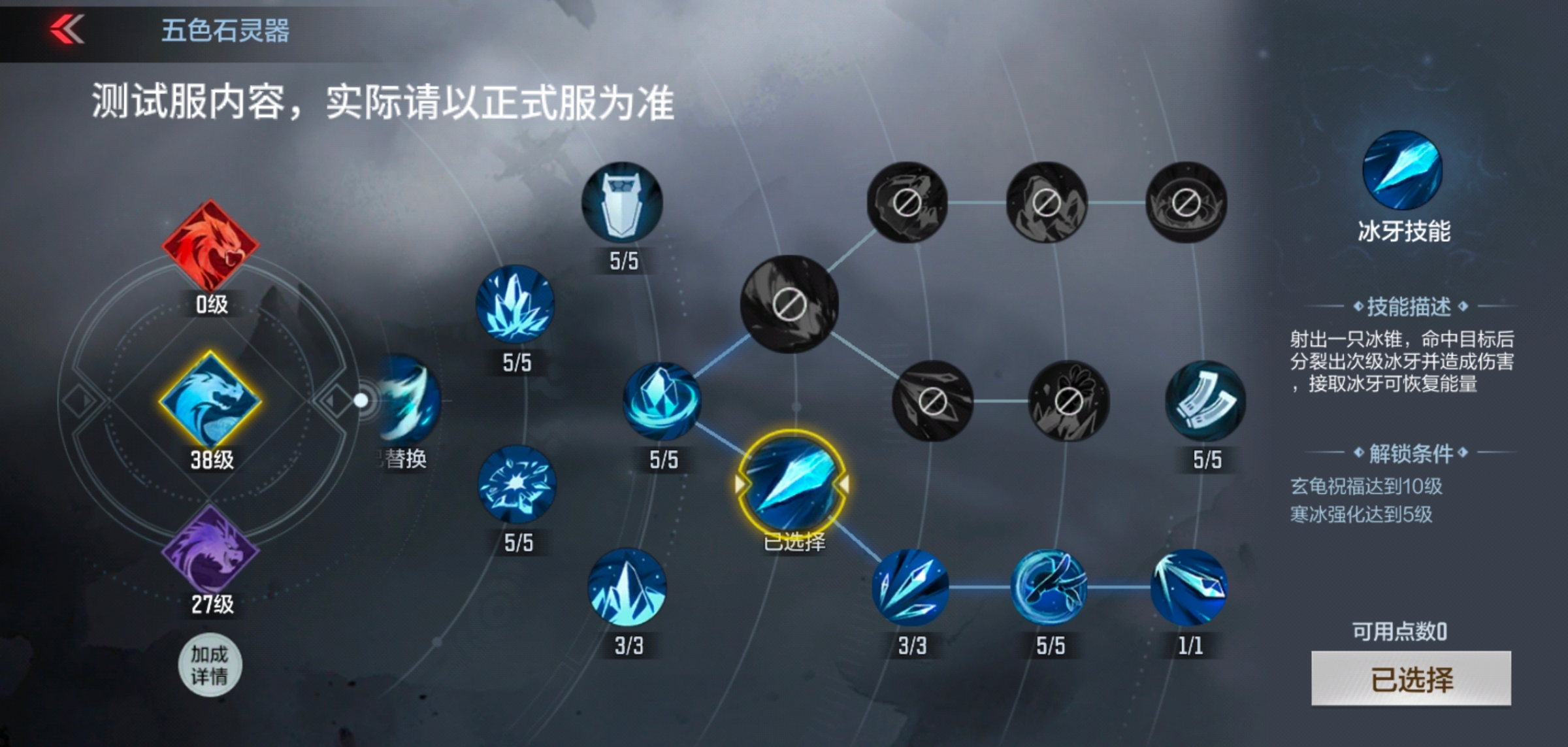 本次灵器系统更新了三款全新技能,分别是:火焰-烈焰刀法、冰霜-冰牙以及雷电-雷云。以玄龟祝福为例,在技能分支第三层寒冰强化后出现分支,CFer们可自行选择寒霜激流技能分支或冰牙技能分支,选择其中一个分支后便只能对此分支的天赋进行加点。