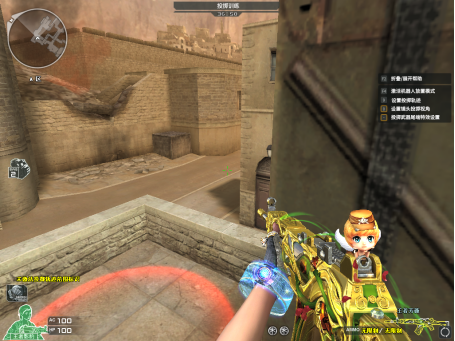 如上图点位展示,作为潜伏者我们可以贴紧A拐柱子,准心瞄准塔尖W前进跳投扔出手雷道具,即可针对保卫者A包点三箱架枪玩家。效果图如下: