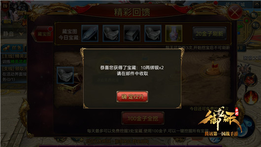 藏宝图每天都会更新奖励,而奖品会有所不同,每次刷新都需要20金,超过部分都需要100金才能继续挖。金子富裕的玩家可以先花20金刷新奖励,刷到自己满意的奖励便可花100金一次挖完。对于金子不富裕的玩家,也能刷新奖励,看到自己喜欢的道具就可以开始挖宝。对于没有金子的玩家也是可以玩的,每天上线就点开藏宝图开始挖,也不需要刷新,就从第一个开始挖,说不定还能挖到一个极品道具奖励。