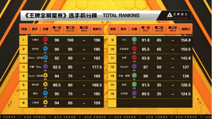 根据《王牌战士》“最强王牌”突围赛企鹅电竞站三轮成绩的最终排名,总分第一名选手“小星光”(压制)、第二名选手“天霸·Ray”(狙击)以绝对的分数优势无悬念突围。总分第三名选手、突袭位第一的选手“CMdxz·逃不掉”和游击位第一的选手“大北”也以较大的优势突围。