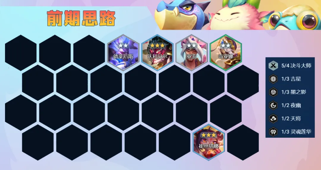 推荐在开局由沃利贝尔或崔丝塔娜的情况下再选择这个玩法。前期的目标就是保持血量健康并快速过渡到七人口。前期可以开出4决斗大师过渡,装备优先给沃利贝尔,因为4决斗大师可以提供高额的攻速效果,所以前期战力很高,只要质量不是太差的话一般不会掉太多血。