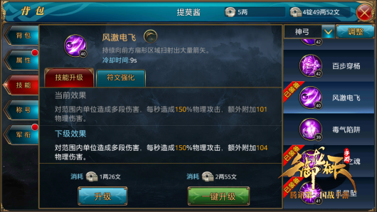 在多人同屏战斗的国战中,PVP不仅讲求速度和攻击力,还要有防御意识。混战中,再多的技巧都没有用,毕竟很多人都是挂机。所以我们最好是选择CD时间少的技能,这样就能源源不断地打击敌人。小白建议:乱星坠(高输出群攻)+百步穿杨(打不过跑)+风激电飞(持续伤害,可攻击多人)+星空箭(高伤害输出)