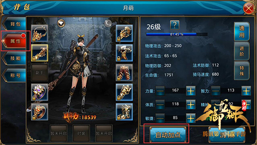 打开背包,进入属性栏,可以看到下方的“自动加点”,系统会根据玩家使用的武器,对属性项目进行加点。如果变换武器也没关系,可以进行“洗点”操作,所需的“洗髓经”在随身商店就有销售,方便快捷。