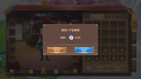 如果包裹位置不够用的话,可以移动到下面,直接点击加锁图标,花50万银币,开5个包裹空间出来。