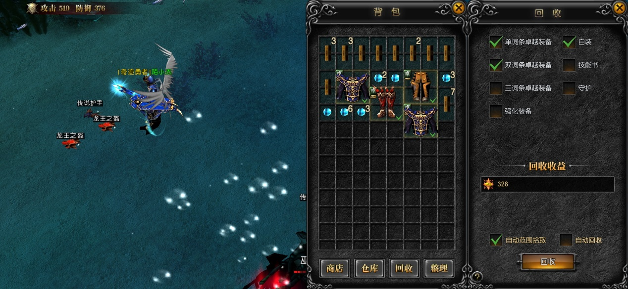 背包中有装备回收功能,白装能回收金币,普通卓越装备能回收奇迹币(流通货币),技能书能回收成技能碎片,用技能碎片可以合成高级装备。装备回收的奇迹币是普通玩家在整个游戏中奇迹币的最大产出来源。