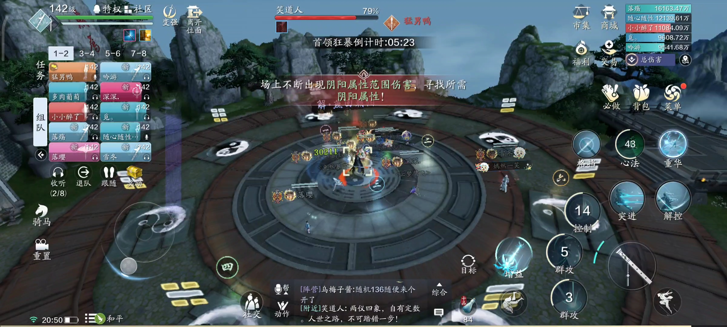 1.挑战过程中,笑道人的技能会附加阴阳属性,携带了“阴阳属性”的少侠若8秒内无法消除则会受到范围伤害。