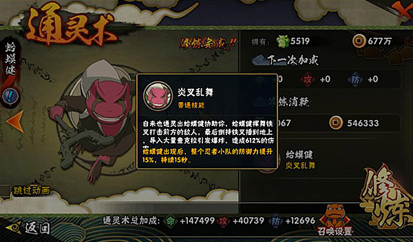 技能炎叉乱舞:自来也通灵出蛤蟆健协助你,蛤蟆健挥舞铁叉打击前方的敌人,最后倒持铁叉插到地上,导入大量的查克拉引发爆炸,造成612%的伤害。
