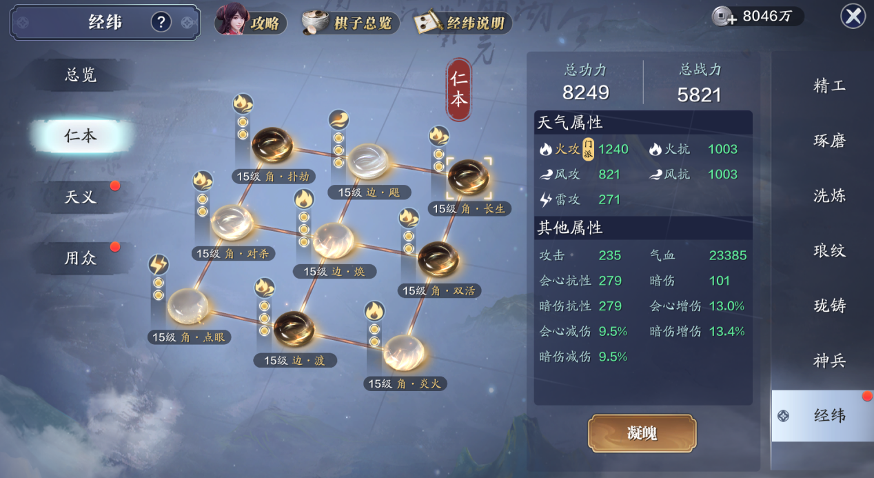 镇派棋子是4星连珠属性,放在星位是毋庸置疑的,2白2黑三星连珠分别放入【白】边·烬、【白】边·飒以及【黑】边·渡、【黑】边·拆,剩下的2星连珠位置放入【白】角·对杀、【白】角·点眼、【黑】角·双活、【黑】角·长生。