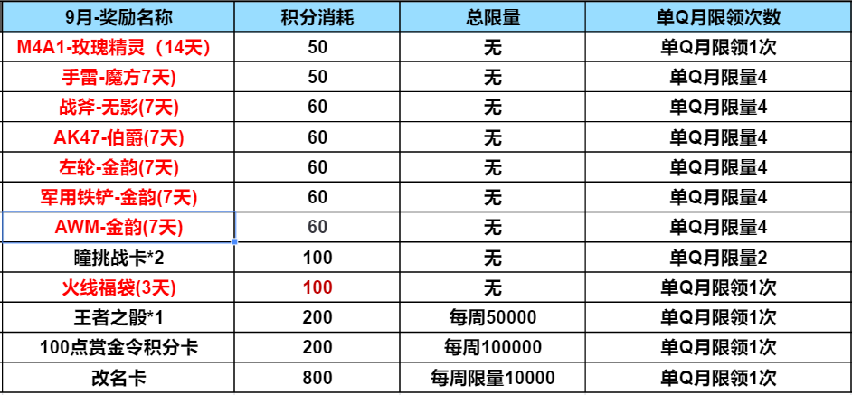 除了累计签到奖励,还有常规积分福利,大家可以兑换心仪的武器道具,不仅有M4A1-玫瑰精灵(14天)、战斧-无影(7天)、AK47-伯爵(7天)还有火线福袋(3天)、王者之骰*1、100赏金令积分卡和改名卡等道具,具体兑换表格如下: