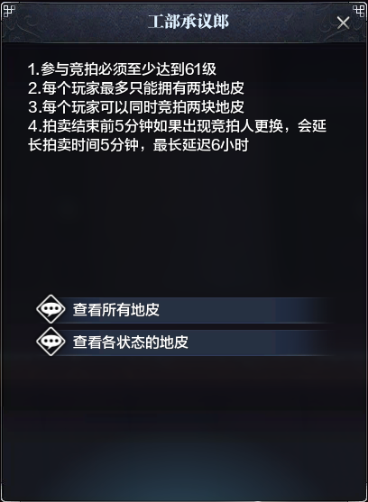 宅邸对应地皮拍卖(分为大、中、小三种地皮),别业对应工部郎中。进行对话后,均可呼出具体规则: