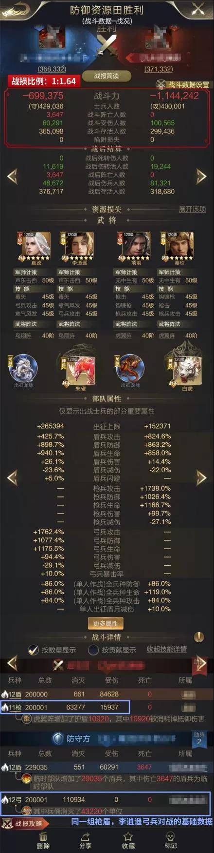 ● 嬴政+逍遥少侠(不带【集中射击】)的组合:左侧紫色标注的弓兵,技能与旧版战报相同,最后弓兵杀敌为145641,盾枪战损共计148W,弓兵输出提升了约29%,战损比为1:2.22。