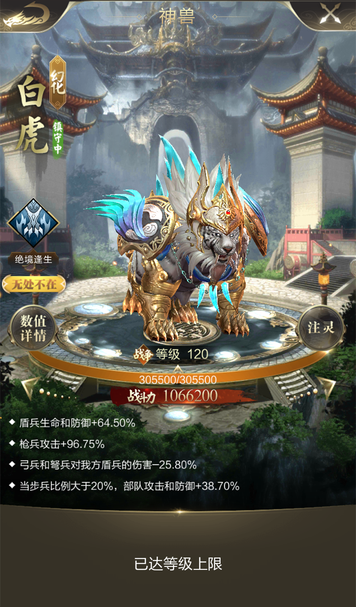 步兵神兽白虎,可以对盾兵、枪兵提供加成效果,其中枪兵攻击加成的效果需要神兽幻化后才可以拥有。神兽60级解锁神兽技能【绝境逢生】,使用后第一次单人攻城或扎营时让盾兵死兵30%转化为伤兵。