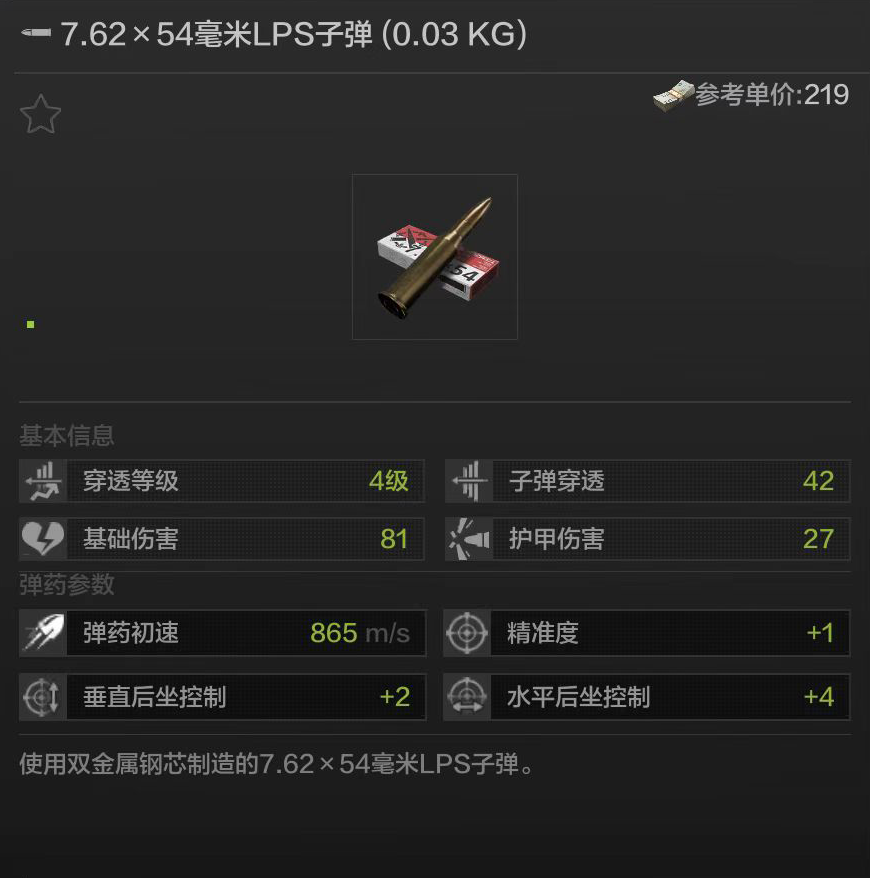 7N37弹又称7.62×54毫米R BS 穿甲弹,有时也简称为BS弹。BS是俄文“标准穿甲”的缩写(Бронебойный стандартный)。这是一款尚在改进中的穿甲弹,子弹外披优质低锌黄铜被甲,内置一颗尖顶圆柱形的碳化钨钴烧结陶瓷穿甲芯,并以铅套加以固定。7N37在侵彻力方面表现优异,据说在近距离甚至可以穿透BMP-1步兵战车的19毫米装甲,因此它也成为了游戏中7.62×54毫米子弹里穿甲属性最高的弹种。