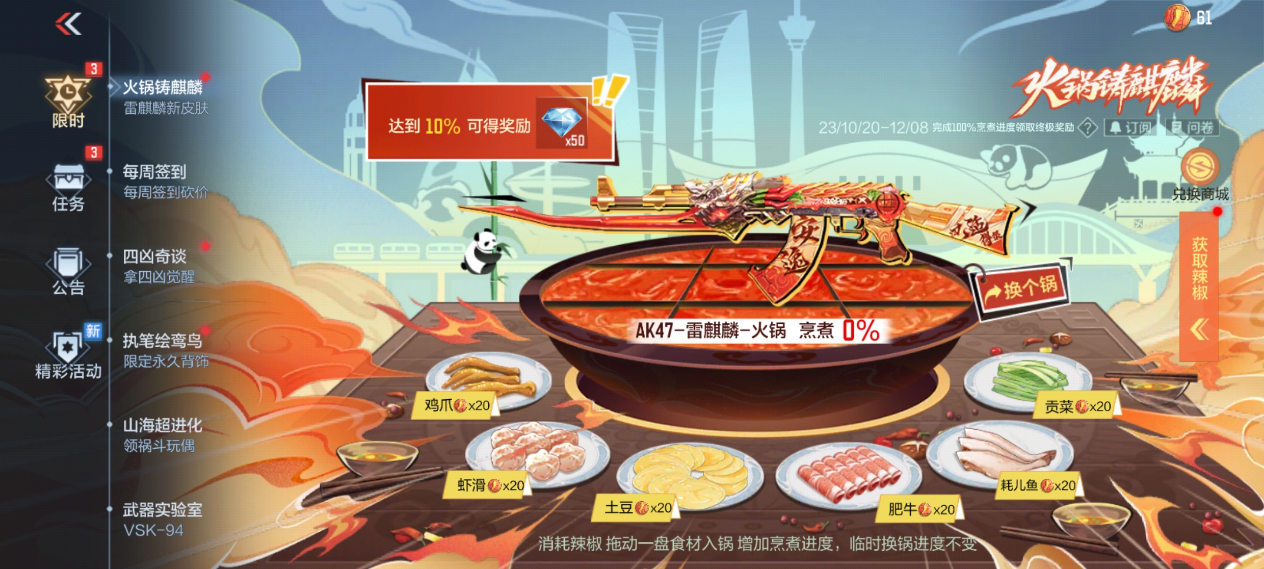 各位CFer大家好~十月金秋,福利不停。又一福利活动火锅铸麒麟登录CF手游。平民神器AK47-雷麒麟、新皮肤AK47-雷麒麟-火锅、憨态可掬的胖达抱抱背饰等你来拿。本期内容我就带大家来详细了解一下这些奖励。