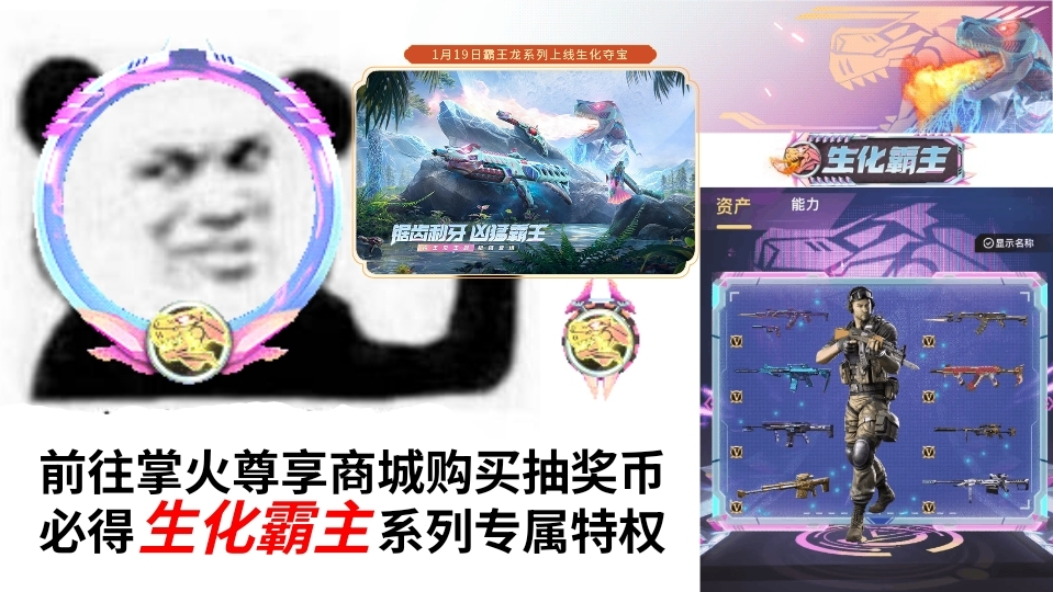 锯齿利牙制霸战场,顶级掠食者霸王龙降临。生化新秀M1216-霸王龙、左轮-霸王龙、霸王龙斧首发上架生化夺宝!热衷生化的小伙伴可前往掌火尊享商城购买生化抽奖币,解锁“生化霸主”系列挂饰、头像框、徽章、称号、动效角色秀等尊贵特权,一键成为最靓的仔~