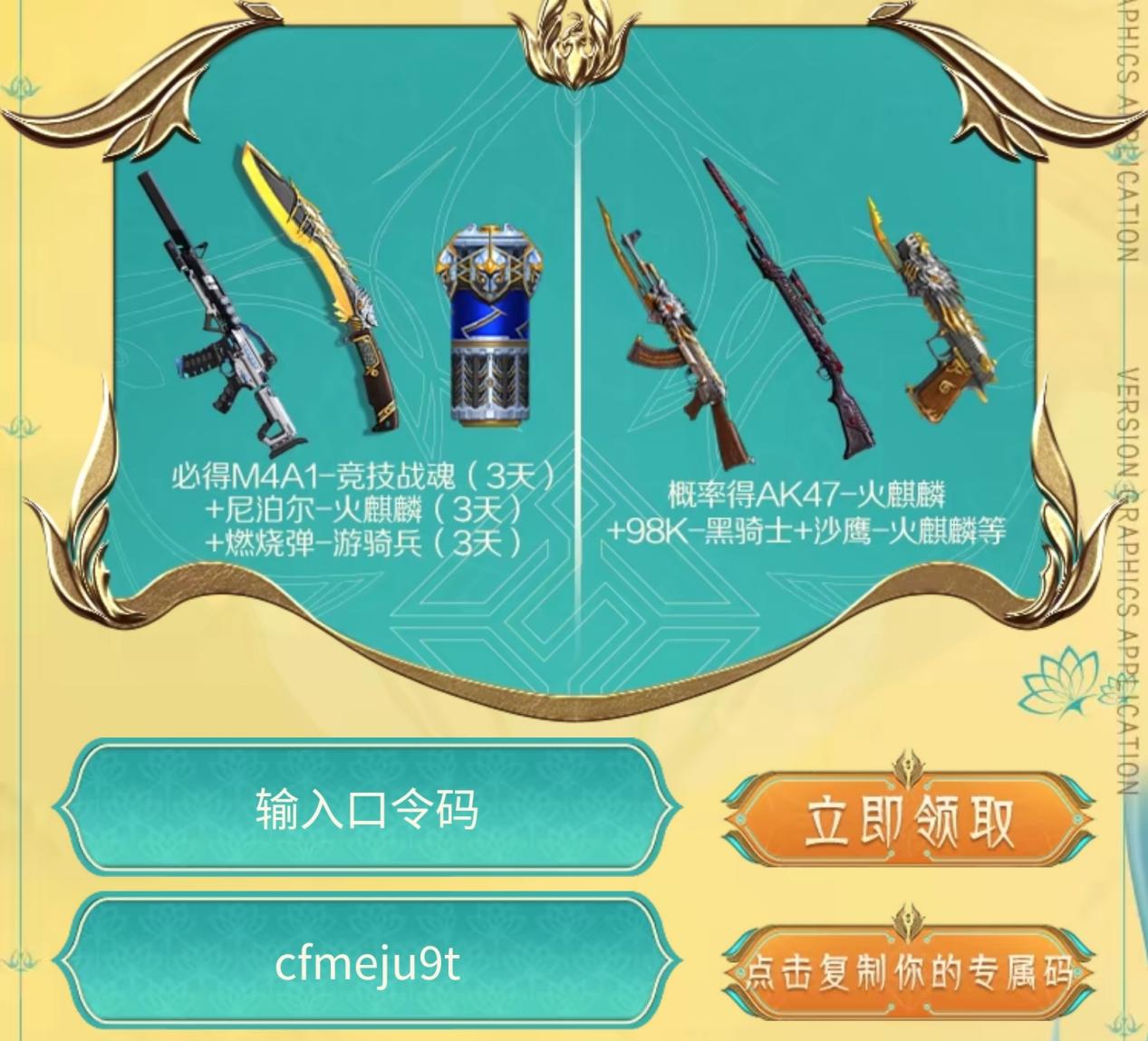 更激动人心的是,还有概率获得穿越火线经典英雄级武器AK47-火麒麟、拥有致命一击技能的轻型狙击枪98K-黑骑士、以及打完弹匣可以变为手雷的沙鹰-火麒麟!别再犹豫了,快去复制好友的专属码领起来吧!