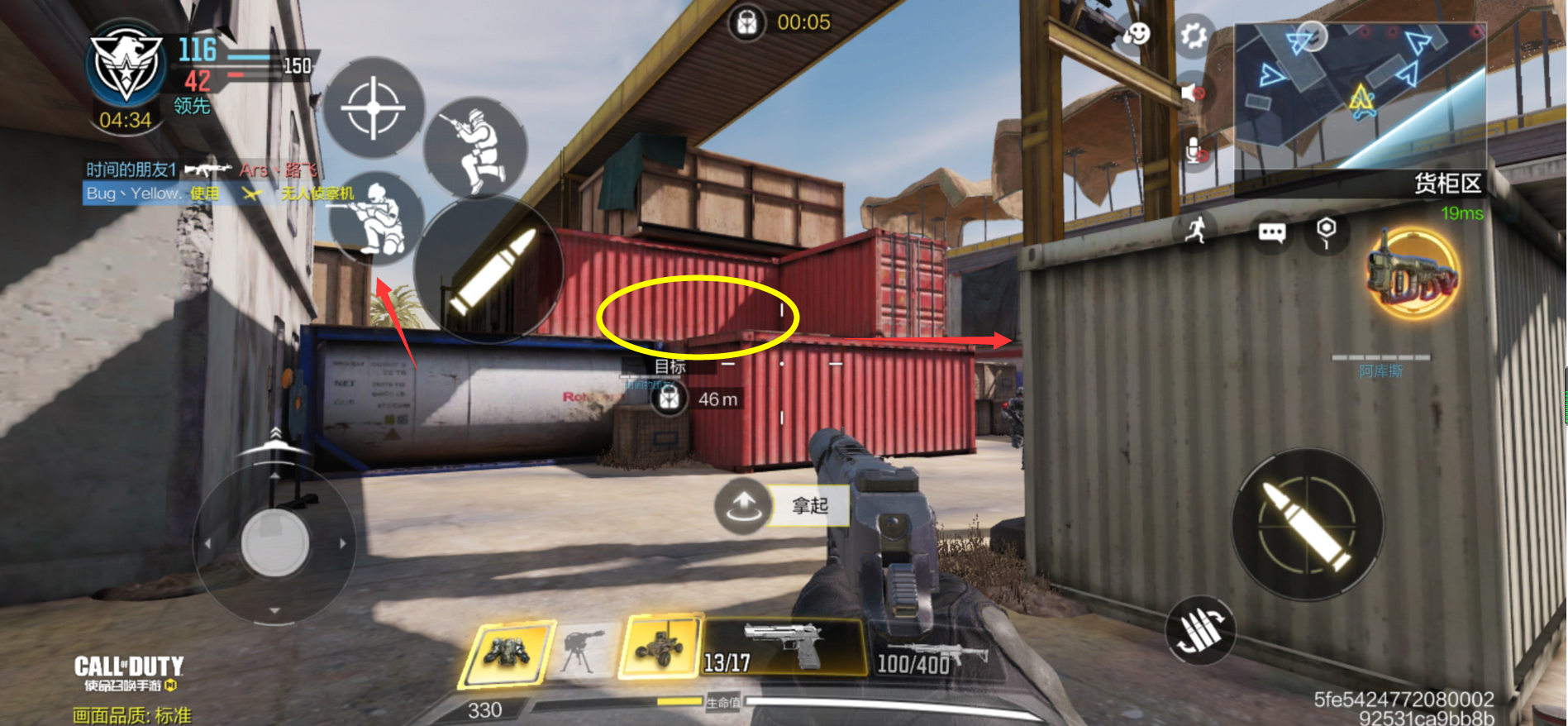攻坚训练场推荐点位位于地图货柜区红色集装箱上(黄色圆圈)。红色集装箱上是一个不错的架点位置,不论哪个模式,这里都拥有优秀的射击视角。